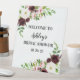 Custom Bridal or Baby shower pedestal sign for tabletops with maroon, blush, and white flowers and roses.