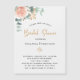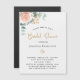 A chic white background. Decorated with a rose gold and blush pink floral, rose flower and green watercolored eucalyptus leaves, sprigs, greenery and a faux gold sprig. Personalise and add the name of the bride to be and party details. Black and golden coloured letters.