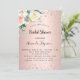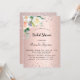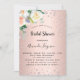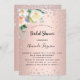 A glamourous bridal shower invitation. A rose gold faux metallic looking background. Decorated with pink faux diamonds and watercolored flowers, floras in white and rose gold with some greenery. Personalise and add the bride to be's name and party details. Black text.