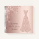 Elegant, classic, glamourous and girly style bridal shower. A rose gold dress with faux rose gold glitter drips. A rose gold faux metallic looking background. With the text: Bridal Shower on the front written with a modern dark rose gold coloured hand lettered style script. Template for the bride's name and the date. A notebook for planning the party or use as a Guest Book.