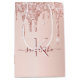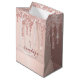 A gift bag for a girly and glamourous Bridal Shower, bachelorette party. A faux rose gold background with elegant pink and rose gold glitter drips, paint dripping look. Personalise and add a name and monogram letter. The name is written in burgundy with a modern hand lettered style script with swashes. To keep the swashes only delete the sample name, leave the spaces or emoji's in front and after the name.