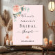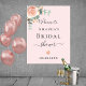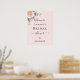 A soft blush pink background. Decorated with a rose gold and blush pink floral, flower (rose) and green watercolored eucalyptus leaves, sprigs, greenery, faux gold sprigs and a happy smiling bee. Personalise and add the name of the bride to be and a date.