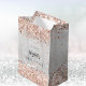 A faux silver looking background decorated with rose gold faux confetti, sparkles. Personalise and a date, and the bride's name.