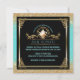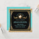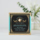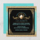 Elegant bridal shower tea party invitations in lovely blue and gold- Centred is a gold metallic look decorative circle frame with leaf scrolls and a vintage look, watercolor floral teapot. Below is the bride's name in Art Deco style, aqua blue green lettering and custom wedding shower details, including RSVP and store registry information. Against a black background with faux gold glitter and blue edges. Faux antique gold metal look frame with scroll corners. Back has coordinating blue background with lightest floral imprint. Unique and beautiful blue and gold bridal shower luncheon invitations. We have coordinating blue and gold envelopes in our Zazzle.com/angela65* shop, as well as other bridal shower tea party invitations.
