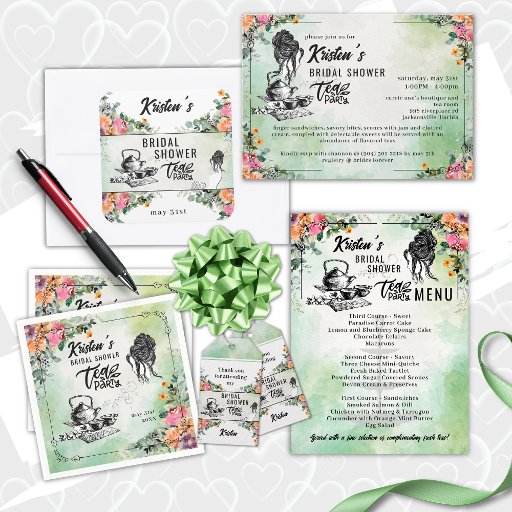 Personalise these gorgeous bridal shower paper napkins and place them out with your tasty treats and drinks for a complete look to your shower table decor. A watercolor green background beautifully displays a woman's head - in profile, with a classic teapot and tea cups and a floral branch. Spring flowers grace opposite corners, along with a decorative square border for a complete look.
