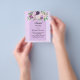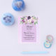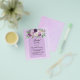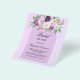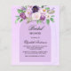 A violet, lavender watercolored background. Decorated with violet and purple flowers. Personalise and add a name and party details. The name is written with a hand lettered style script.