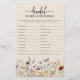 Bridal Word Scramble Game. - This stylish & elegant bridal shower game features gorgeous hand-painted watercolor wildflowers arranged as a lovely frame and elegant calligraphy script. The back includes a lovely coordinating pattern. (Answer Key - honeymoon, reception, groom, bouquet, first dance, invitation, husband, marriage, groomsmen, bridesmaid, love, bridal shower, save the date, engaged, wife, marriage, kiss the bride, bride to be, tie the knot, wedding bliss)