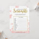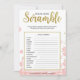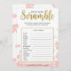 This modern floral "Bridal Word Scramble" features a pink floral background with golden glitter splashes. The text is written in a mix of a playful calligraphy font and a modern sans font, this Bridal Word Scramble card is personalised with the Bride-to-be name and the Bridal Shower date.