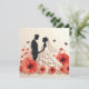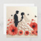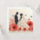 Beautiful illustration of a couple in wedding attire with a background of red poppies and black butterflies. The couple is in silhouette, with the groom in a suit and the bride in a flowing dress with a veil. The overall colour scheme is red, black, and white.