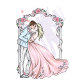 Illustration of a wedding couple kissing under a floral arch, the man is white, 28 years old, with brown hair, wearing a light blue suit and white pants, the woman is white, 25 years old, with blonde hair, wearing a long pink dress with floral details, the arch is decorated with pink and white roses and green leaves, the style is cartoonish with bold outlines and soft colours.