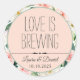 This custom coffee label makes a great party favour for weddings, bridal showers or engagement parties. It features a title "Love is Brewing" with a text template to personalise with the bride and groom's names and wedding date. The background in the centre of the design is a feminine blush pink surrounded by a blush and white watercolor roses pattern with scattered greenery. Some uses for this sticker include putting them on disposable coffee cups or other drinkware or on coffee or tea themed party favours.