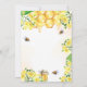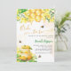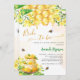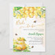 A stylish white and golden watercolored background. Decorated with bumble bees, melting honey and honeycomb with yellow florals, flowers and a wedding cake with lemons. With the text: Bride to bee written with a modern hand lettered style script. Personalise and add the name of the bride to bee.