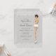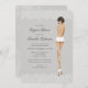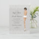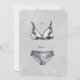 Lingerie bridal shower invitation features bride to be in her underwear with a lacy background. Multiple options available for bride's hair and skin tone.