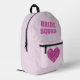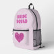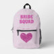 Personalised bridesmaid backpack bags for the fun and elegant wedding featuring pink background with a pink heart on the pocket, and personalised with the name of each bridesmaid. Great gift for the bride squad.