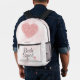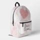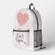 Personalised bridesmaid backpack bags for the fun and elegant wedding featuring pink and white background with a large pink heart on the front and a pink heart on the pocket, and personalised with the name of each bridesmaid. Great gift idea for the bride squad in your wedding.