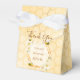 A favour box for a summer Bridal Shower. Yellow, white background with a honeycomb pattern. With a faux gold geometric frame. Decorated with light yellow, cream coloured tropical florals flowers, hibiscus and happy bumble bees. With the text: Thank You and Bride to Bee written with a modern hand lettered style script. Template for the bride to be's name and the date of the shower. Brown letters.