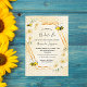 Elegant, fun summer bridal shower invitation. Yellow, white background with a honeycomb pattern. With a faux gold geometric frame. Decorated with light yellow, cream coloured tropical florals flowers, hibiscus and happy bumble bees. With the text: Bride to Bee and the name of the bride on front written with a modern hand lettered style script. Black letters.