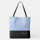 This lovely fashion forward tote bag shows the word "Bride" in a Golden-Caramel text colour over Black with the upper tote bag in Light Blue with petite Golden stars print all over. Has plenty of room for personalised text. Graphics and text are on both sides of this tote bag. Black handle. Customise further or buy as shown.