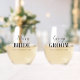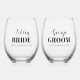 Bride's and groom's names black typography wedding set of two Stemless Wine Glasses. Get ready to toast in style with this elegant wedding set of two Stemless Wine Glasses! The black typography design adds a touch of sophistication to your special day. The first glass is personalised with the name of the beautiful bride, while the second glass showcases the name of the dashing groom in script typography. The words 'BRIDE' and 'GROOM' are written in a bold font. Cheers to a lifetime of love and happiness!