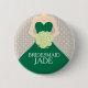 Elegant graphic green bridesmaid dress holding a posy of light green stylised roses pin button badge. Reads Bridesmaid Jade, Or personalise with your own names. Great for bridal showers, wedding rehearsals or to add to wedding favour bags. © Art and design by Sarah Trett, exclusively for www.mylittleedenweddings.com