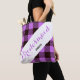 Modern, elegant and trendy customisable tote bag features "bridesmaid", "personalised name" beneath on a white stripe and Orchid / black plaid tartan background.