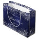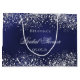 A navy blue background decorated with faux silver confetti, sparkles. The blue colour is uneven. Personalise and a date, and the Bridesmaid's name.