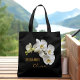 Bridesmaids and bridal party gift tote bags. Realistic, white orchids design on both sides of a quality, black tote bag. Personalise with her name and title (bridesmaid, maid of honour, junior bridesmaid, or flower girl) in golden yellow script and modern printed text. On the other side, include her monogram initial. Be sure to customise both sides.