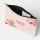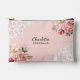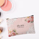A blush pink background. Decorated with pink roses, flowers and white lace.
