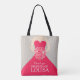 Elegant graphic red bridesmaid dress holding a posy of red stylised roses favour tote bag. Reads Thank you Bridesmaid Louisa, Or personalise with your own names. Great to add use as wedding favour bags. Other matching items are available. Original art and design by Sarah Trett for www.mylittleeden.com