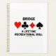 If you play the game of bridge or duplicate bridge, you'll enjoy this planner featuring the four card suits along with the bridge saying "Bridge A Lifetime Recreational Skill". No need to be a bridge teacher or avid bridge player to understand the benefits from learning this recreational skill that will keep your mind occupied for a lifetime!