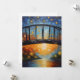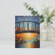 A vibrant sunset casts a warm glow over a serene river, crossed by a silhouetted bridge with trees lining both shores. The sky is dotted with colourful, mosaic-like patches, creating a lively and dynamic backdrop.