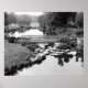 A small wooden bridge spans a lake that looks like a mirror, reflecting the many trees around it. Large white rocks can act as stepping stones, and a small cottage peeks out, draped in greenery.