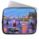 This laptop sleeve features a stylised view of the Southwark and Tower Bridge from the Millenium Bridge in London, England at night, with boats passing on the Thames River underneath.