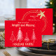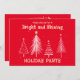 A festive Bright and Shining Christmas Holiday Party Invitation Card with gold colored text and elegant white Christmas Trees on a bold red background. The front text includes: Please Join Us For A Bright and Shining Holiday Party. The reverse text includes: The Date, Time, Location, Host and RSVP Info. To personalize, simply insert your details into our easy template, replacing the sample text. Colors may be changed using our easy Color Picker Tool.