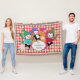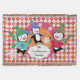 Beautiful Christmas holiday throw blanket features three adorable penguins in ice skates, sweaters, striped scarves, and winter hats on a background of white, red, orange, and pink argyle, a solid pink area with white snowflakes, and a deep orange with white polka dots centre. You can easily personalise with your family name!