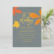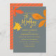 Fall Wedding invitation featuring Autumn orange, mango and mustard chosen for the wide variety of Fall flowers in these colours. A light charcoal colour contrast to balance the theme. Cursive handwriting script and watercolor painted leaves are up to the minute in Wedding card trends.
