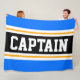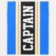 This sporty, athletic design features bold CAPTAIN text inside a highlighted wide black stripe with double white and yellow racing stripes against bright blue outer stripes. The text can be personalised.