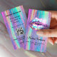 Holographic lips with a flashy light flare against a bright bold and colourful background. Easily personalise with your business information including a handy QR Code and an area to display your social media info. This design works best on the semi gloss paper option.