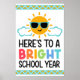 A joyful and energetic design featuring a beaming yellow sun with sunglasses, surrounded by fluffy white clouds and radiant orange rays. The phrase “HERE’S TO A BRIGHT SCHOOL YEAR” shines beneath, with “BRIGHT” spelled in bold, multicolored letters that add a cheerful and inclusive tone. Framing the design are geometric top and bottom borders in vibrant shades of blue, yellow, and orange, giving it a polished, celebratory feel. This customisable artwork sets the perfect tone for welcoming a new academic journey with positivity and enthusiasm.