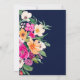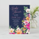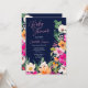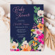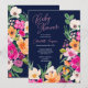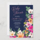 Elegant bright and bold modern spring summer flowers illustration with pretty oversized wild flower and brush script country garden baby shower party invitation with a modern calligraphy typography with bright neon pink, orange, green and yellow flowers on editable navy blue background.