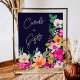 A cards and gifts sign with Elegant bright and bold modern spring summer flowers illustration with pretty oversized wild flower and brush script bridal shower sign with a modern calligraphy typography with bright neon pink, orange, green and yellow flowers on navy blue