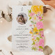 A bright, bold yellow, pink, orange floral and green leaves photo chic initials wedding invitation featuring an original and pretty floral hand painted flowers with brown and green foliage on the side. Featuring a photo in a circle with a modern stylish script font typography, when rustic boho meets modern elegance weddings.