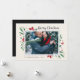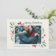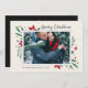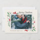 Elegant and festive holiday photo card frames your favorite horizontal or landscape oriented image with a subtle deckled edge border and red and green holiday foliage peeking out at the corners. "Merry Christmas" appears at the top right in black calligraphy script, with your names and the year at the lower left, on a soft ivory background. Personalize with a custom personal message on the back, along with two additional photos.