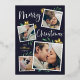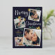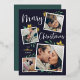 Our beautiful rustic chic holiday photo card features four of your favourite square family photos in a collage layout. "Merry Christmas" appears white hand lettered calligraphy script typography on a rich navy blue background accented with green watercolor leaves, gold foil poinsettia flowers, and gold foil holly berries. Customise with your family name or personal message.
