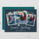Elegant and festive holiday photo card frames three of your favourite square photos with a subtle deckled edge border and green and white holiday foliage peeking out at the corners. "Season's Greetings" appears along the bottom in white calligraphy script, with your names and the year beneath.
