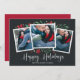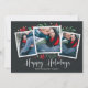 Elegant and festive holiday photo card frames three of your favourite square photos with a subtle deckled edge border and red and green holiday foliage peeking out at the corners. "Happy Holidays" appears along the bottom in white calligraphy script, with your names and the year beneath.