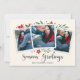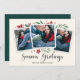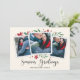 Elegant and festive holiday photo card frames three of your favourite square photos with a subtle deckled edge border and red and green holiday foliage peeking out at the corners, on a soft ivory background. "Season's Greetings" appears along the bottom in black calligraphy script, with your names and the year beneath.