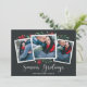 Elegant and festive holiday photo card frames three of your favourite square photos with a subtle deckled edge border and red and green holiday foliage peeking out at the corners. "Season's Greetings" appears along the bottom in white calligraphy script, with your names and the year beneath.