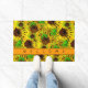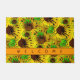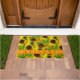Welcome doormat features a bright cheery artistic sunflower design in a vibrant yellow, green and orange palette with complimentary brown accents on a peachy orange background with "welcome" on an orange banner with complimentary brown accents and text. The welcome message is customisable and presented in coordinating stylised typography. This stylish floral doormat will add a splash of colour to any modern home's doorstep.