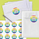 A round sticker of a brightly coloured icing on a 2 layer white cake that says "Happy Birthday" with hand lettering on each layer. Appropriate for any ones birthday! Stick the on presents, bags or scrapbooks.